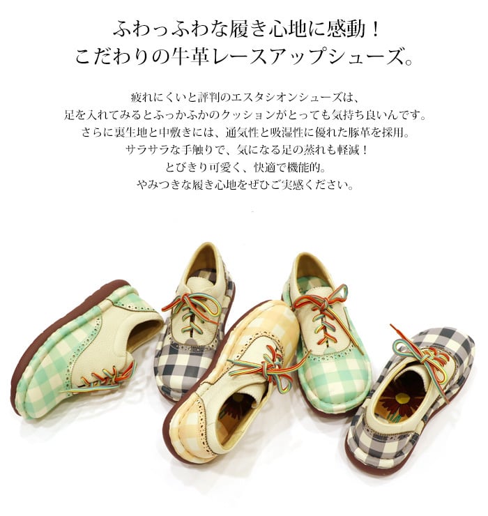 カジュアルシューズ.エスタシオン.靴.レディース.estacion.本革.ブランド.レースアップ.フラット.チェック.レザー.歩きやすい.カジュアル.柄.ローヒール.SS.S.M.L.LL.22.0cm.22.5cm.23.0cm.23.5cm.24.0cm.24.5cm.25.0cm