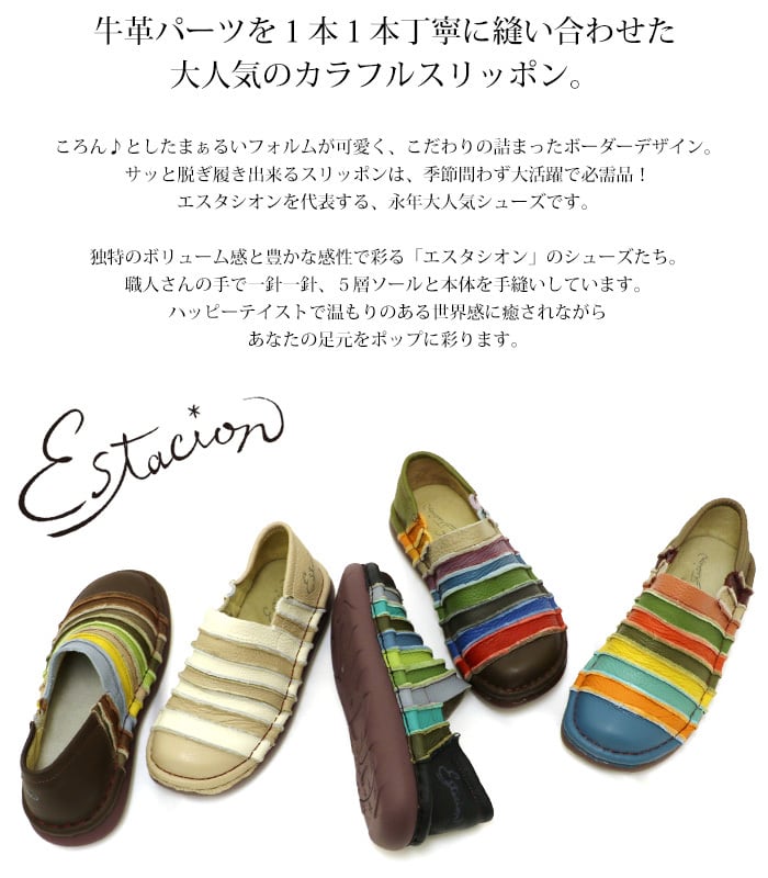 スリッポン.靴.レディース.エスタシオン.スニーカー.本革.レザー.estacion.えすたしおん.ブランド.ボーダー.カラフル.フラット.カジュアル.軽量.歩きやすい.柔らかい.SS.S.M.L.22.0cm.22.5cm.23.0cm.23.5cm.24.0cm.24.5cm
