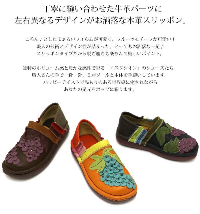 スリッポン.エスタシオン.スニーカー.靴.レディース.estacion.レザー.コンフォート.フラット.ローヒール.軽量.フルーツ.ぶどう.歩きやすい.新作.カジュアル.本革.人気.SS.S.M.L.LL.22.0cm.22.5cm.23.0cm.23.5cm.24.0cm.24.5cm.25.0cm