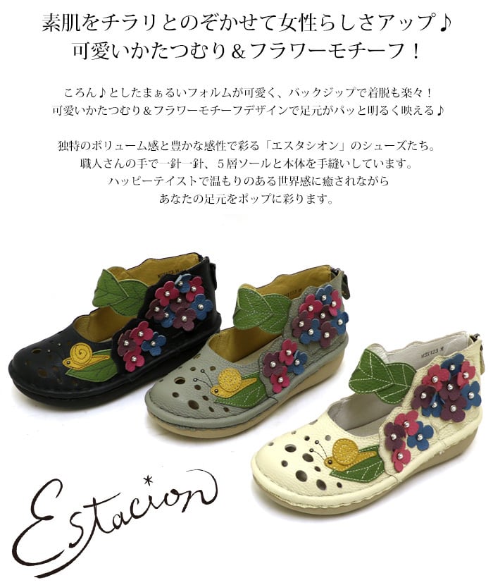 ブーツ.エスタシオン.靴.レディース.estacion.本革.ブランド.シューズ.軽量.コンフォート.歩きやすい.フラワー.花.ショートブーツ.ジップ.レザー.ローヒール.厚底.新作.SS.S.M.L.LL.22.0cm.22.5cm.23.0cm.23.5cm.24.0cm.24.5cm.25.0cm