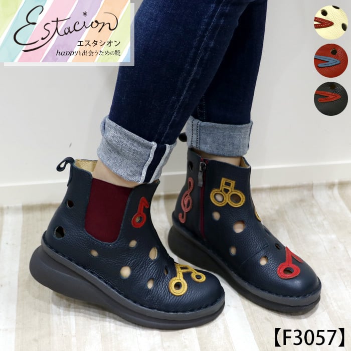 ブーツ.音符モチーフ.エスタシオン.靴.レディース.estacion.本革.ブランド.フラット.ウェッジ.疲れない.新作.柔らかい.サイドゴア.レザー.パンチング.カジュアル.厚底.ローヒール.SS.S.M.L.LL.21.5cm.22.0cm.22.5cm.23.0cm.23.5cm.24.0cm.24.5cm.25.0cm