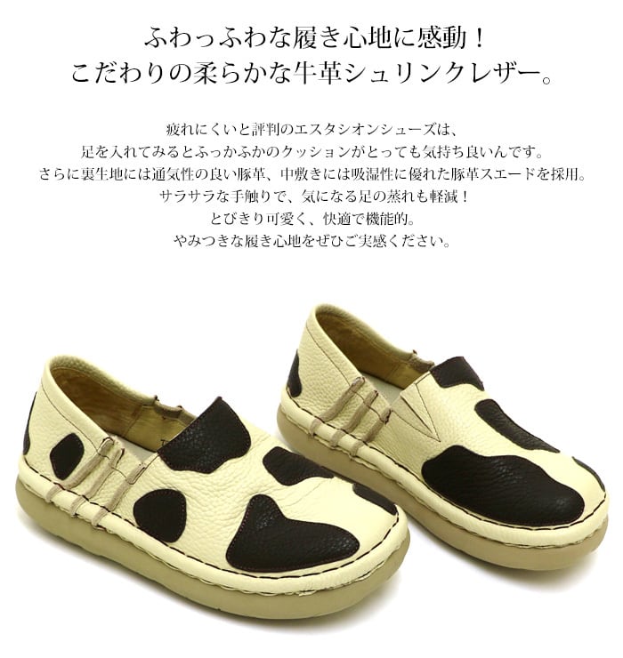 TGE398【レディース/受注生産可】Estacion~エスタシオン~・牛柄モチーフ本革スリッポンシューズ