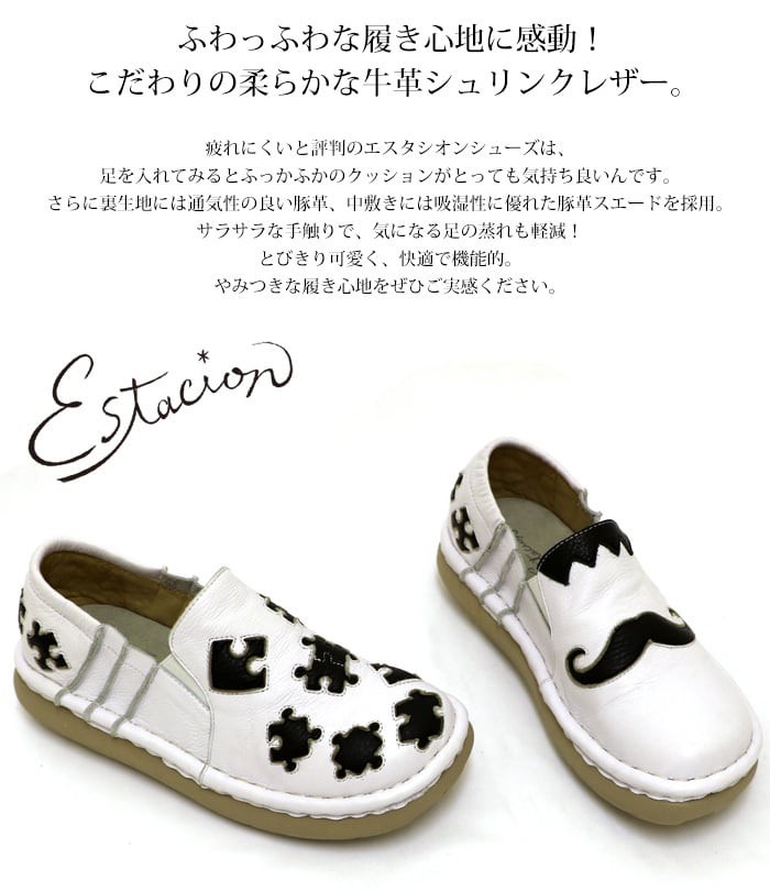 スリッポン.エスタシオン.スニーカー.靴.レディース.estacion.レザー.コンフォート.フラット.新作.ローヒール.軽量.本革.歩きやすい.お髭.モチーフ.カジュアル.SS.S.M.L.LL.22.0cm.22.5cm.23.0cm.23.5cm.24.0cm.24.5cm.25.0cm
