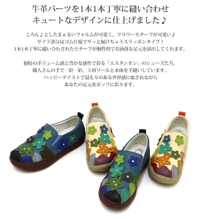 スリッポン.スニーカー.エスタシオン.靴.レディース.estacion.本革.ブランド.厚底.フラット.新作.疲れない.柔らかい.レザー.花.フラワー.カジュアル.ローヒール.SS.S.M.L.LL.22.0cm.22.5cm.23.0cm.23.5cm.24.0cm.24.5cm.25.0cm