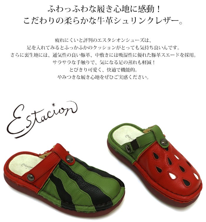 サボ.サンダル.エスタシオン.靴.レディース.estacion.本革.ブランド.軽量.カジュアル.疲れにくい.歩きやすい.2way.すいか.フルーツ.レザー.フラット.ローヒール.SS.S.M.L.LL.22.0cm.22.5cm.23.0cm.23.5cm.24.0cm.24.5cm.25.0cm