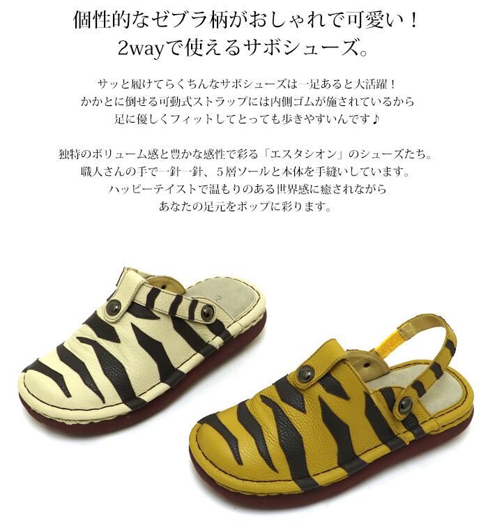 サボ.サンダル.エスタシオン.靴.レディース.estacion.本革.ブランド.軽量.カジュアル.疲れにくい.歩きやすい.2way.ゼブラ柄.アニマル.レザー.フラット.ローヒール.SS.S.M.L.LL.22.0cm.22.5cm.23.0cm.23.5cm.24.0cm.24.5cm.25.0cm