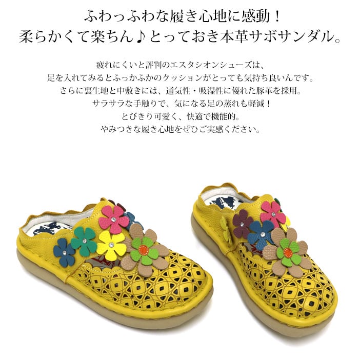 サボ.サンダル.エスタシオン.靴.レディース.estacion.本革.ブランド.軽量.カジュアル.疲れにくい.歩きやすい.フラワー.花.レザー.フラット.ローヒール.SS.S.M.L.LL.22.0cm.22.5cm.23.0cm.23.5cm.24.0cm.24.5cm.25.0cm