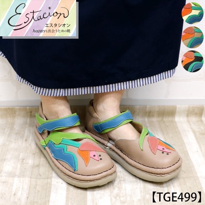TGE499【レディース】Estacion~エスタシオン~・チューリップモチーフ本革ストラップシューズ